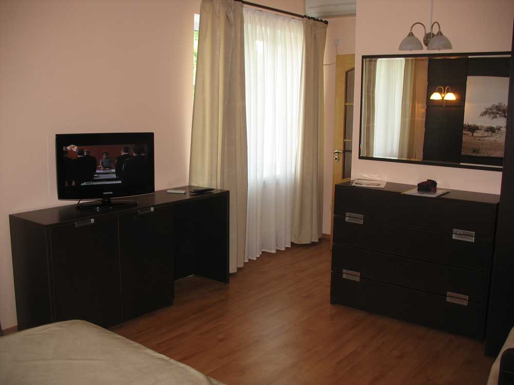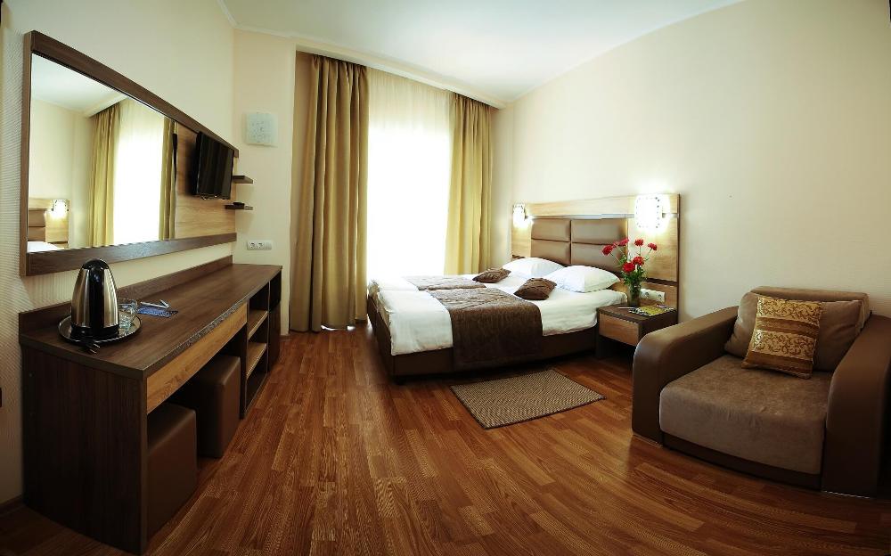 - 2-местный 1-комнатный Полулюкс. Площадь: 18 кв.м.. В номере: двуспальная кровать, балкон, ванная комната с душевой кабиной, фен, холодильник, телевизор, балкон, двуспальная кровать, сплит-система, сейф.