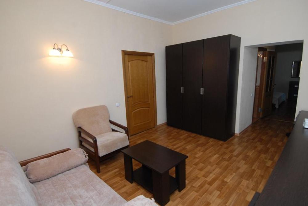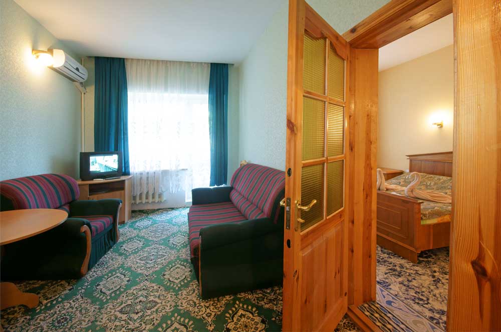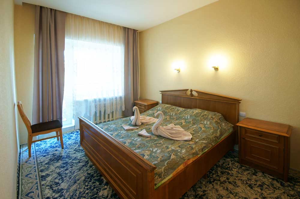 - 2-местный 2-комнатный Люкс. Площадь: 36 кв.м. В номере: гостиная с мягким раскладным диваном и двумя креслами, спальня с двуспальной кроватью, просторная прихожая, балконом с видом на парковую аллею, телевизор, фен, 2 санузла, сплит-система, холодильник, кондиционер, чайник, сейф.