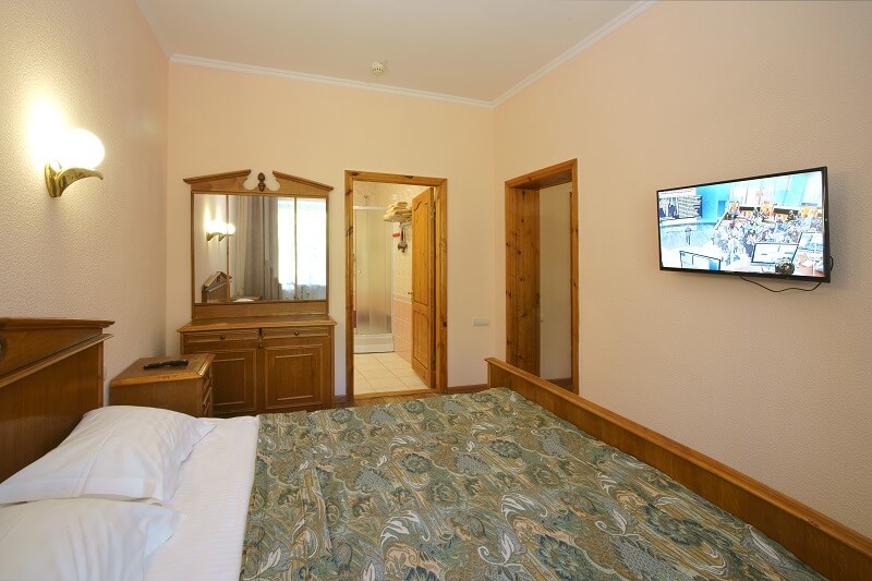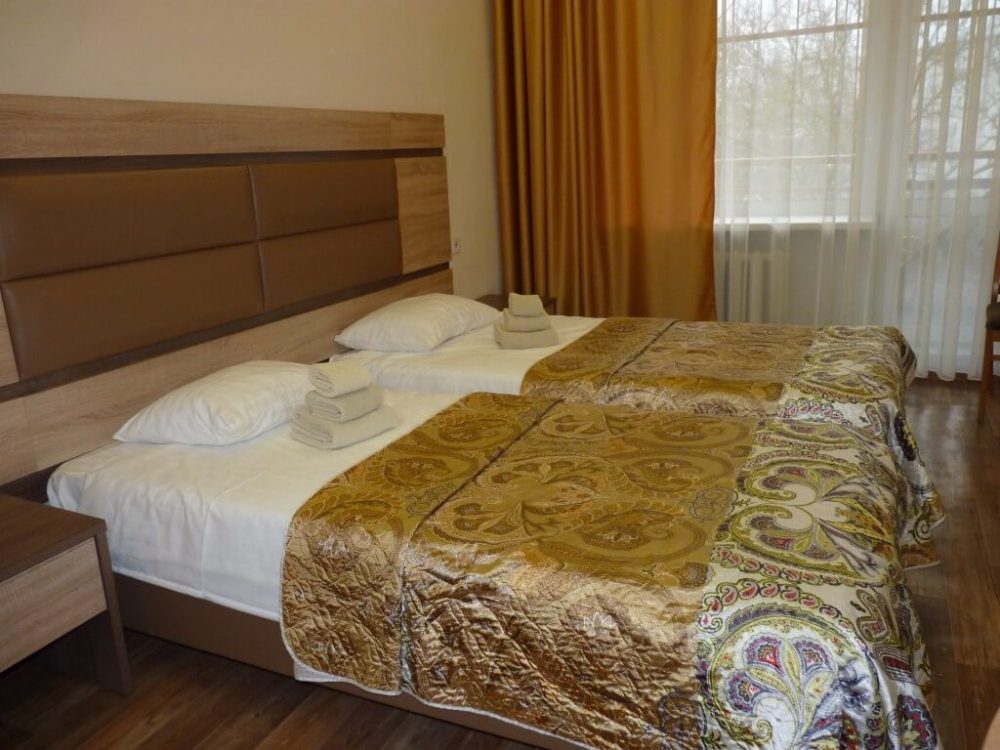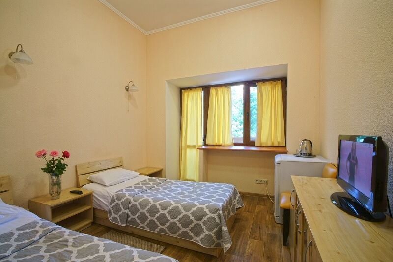 - 2-х местный Стандарт. Площадь: 18 кв.м. В номере: две раздельные кровати с ортопедическими матрацами, телевизор, холодильник, ванная комната с душевой кабиной, фен, централизованная система отопления и кондиционирования.