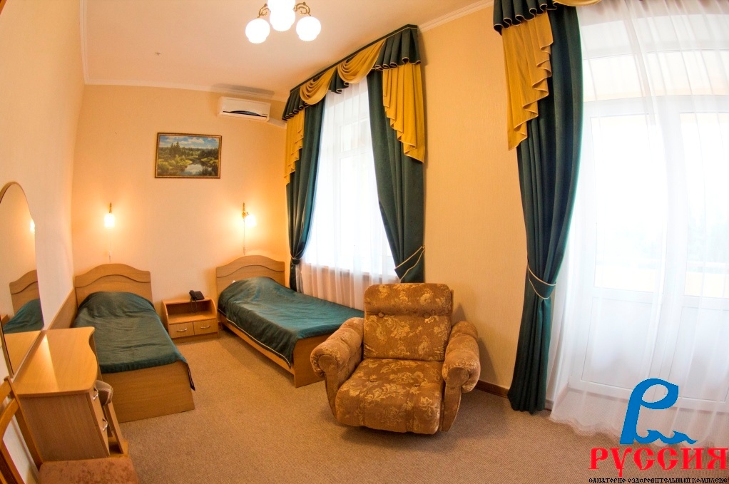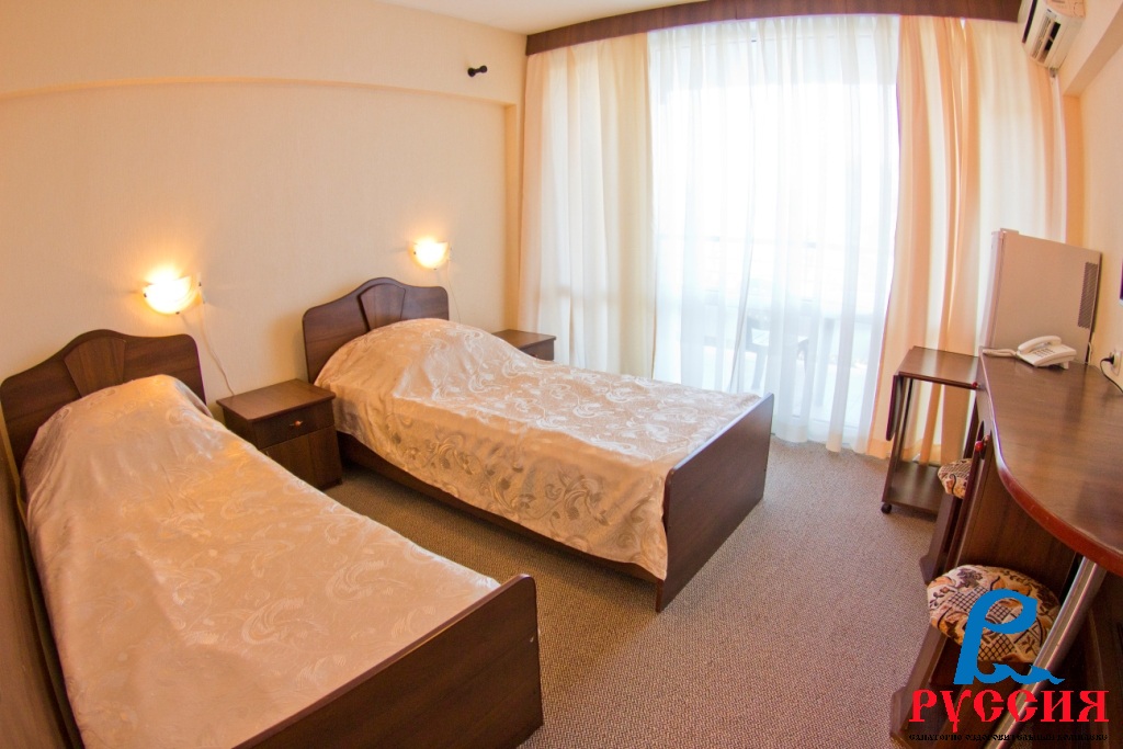 - 2-х местный 1-но комнатный номер / 2-х местный 1-но комнатный номер ( угловой ). Площадь 13-14 кв.м.. В номере: две односпальные кровати, телевизор, холодильник, кондиционер, сейф, санузел. Лоджия с набором летней мебели, вид на море или парк.