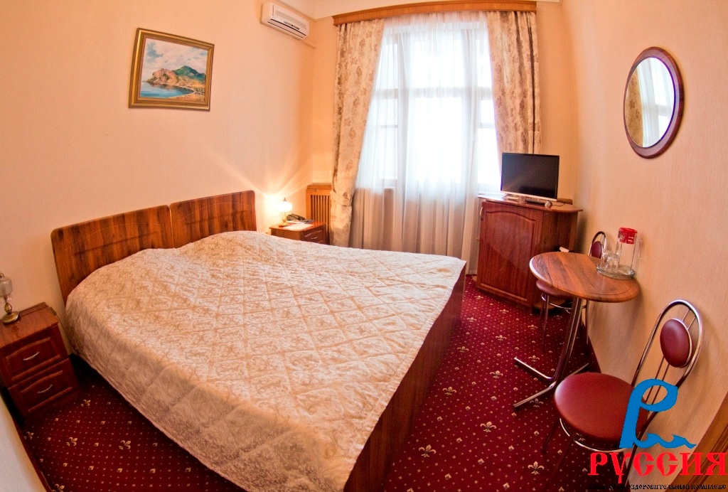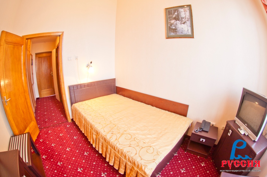 - 1-но местный 1-но комнатный номер. Площадь 9-10 кв.м.. В номере: односпальная или полутораспальная кровать, телевизор, холодильник, кондиционер, сейф, санузел. Вид из окон в парковую зону, балкона нет.