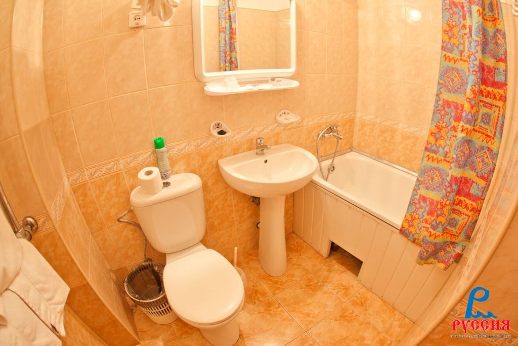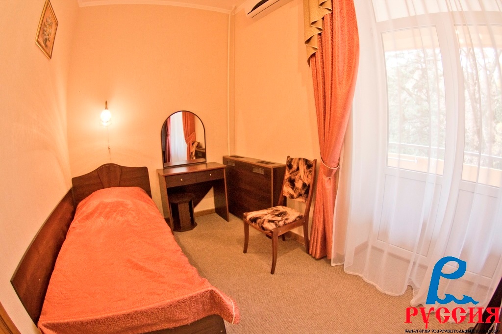 - 1-но местный 1-но комнатный. Площадь 9-10 кв.м.. В номере: односпальная кровать, телевизор, холодильник, кондиционер, санузел. Лоджия с набором летней мебели, вид на парковую зону.
