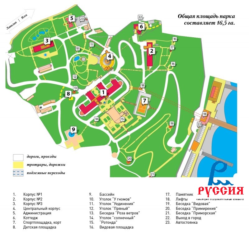 3-этажный без лифта. Удаленность от моря: 200-250 м. Находится в центральной части парковой зоны, соединен подземной галереей с корпусом-столовой (расстояние 50 м). На 1-м этаже находится лечебно-оздоровительное отделение.