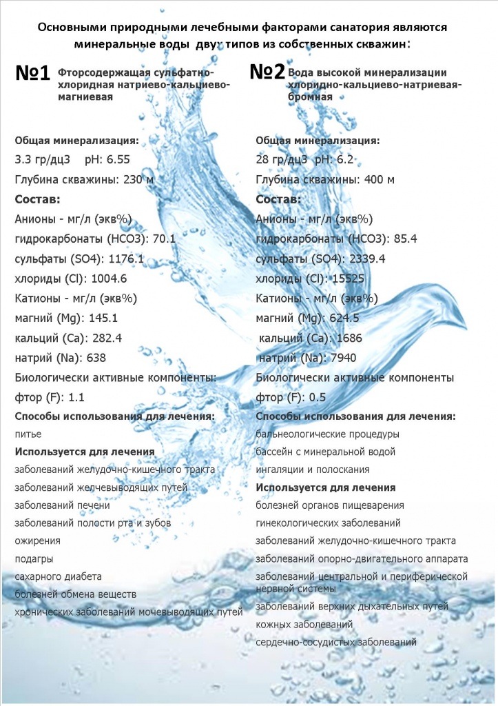 - Источник №1: питьевая фторсодержащая сульфатно-хлоридная натриево-кальциево-магниевая