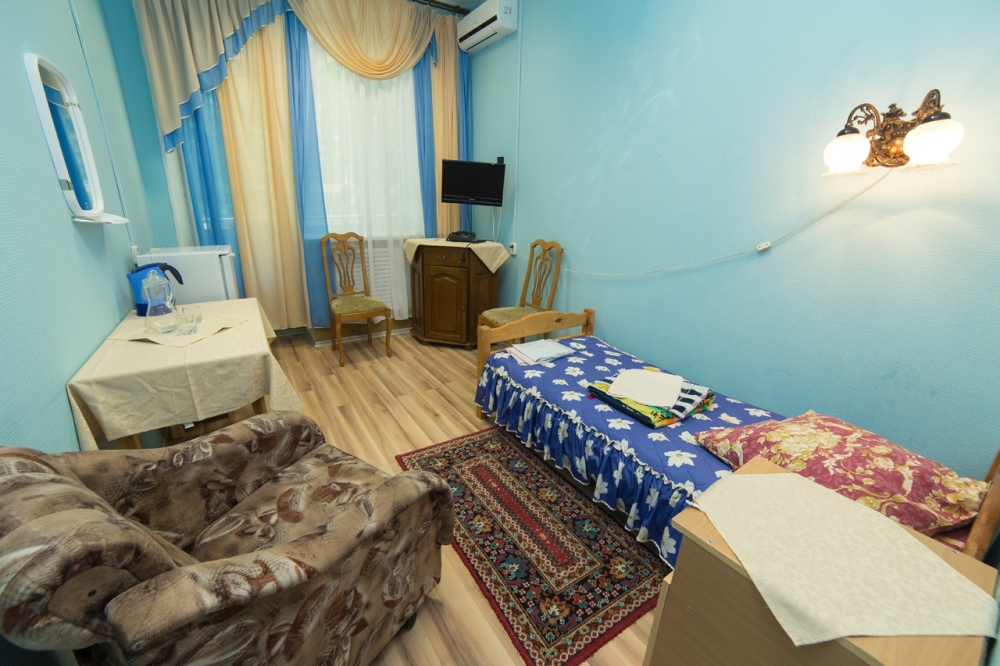 - 1-но местный номер стандарт. В номере: односпальная кровать, душ, туалет, ТВ, холодильник, чайник, телефон.