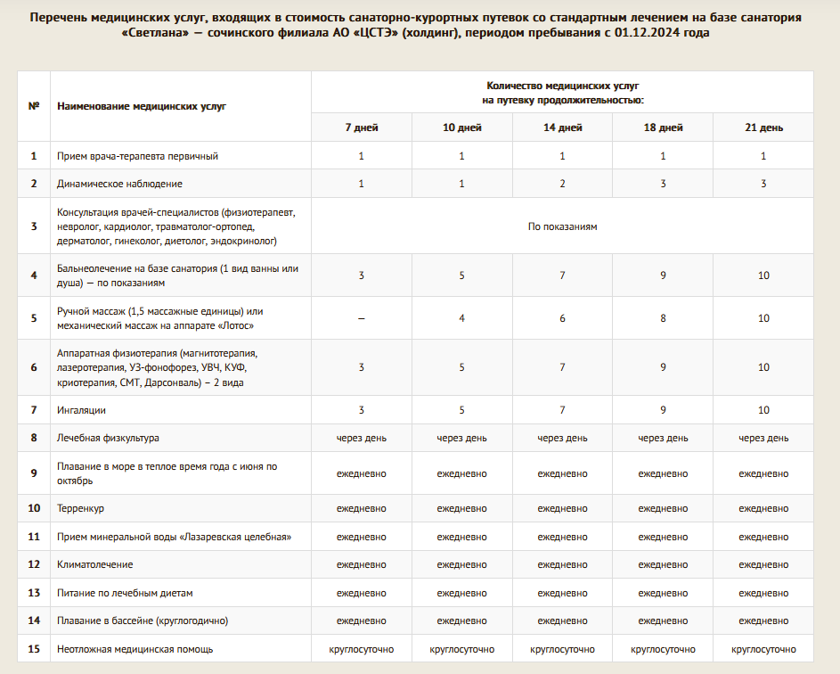 В стоимость входит: проживание, 3-х разовое питание «шведский стол», базовое лечение для путевок с лечением, пользование пляжем (городской или пляж санатория «Жемчужина»), wi-fi.