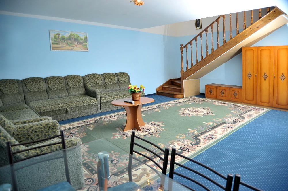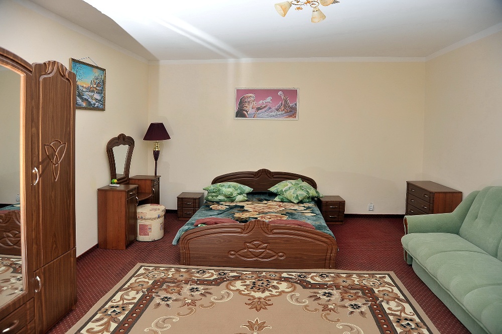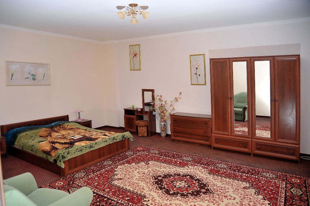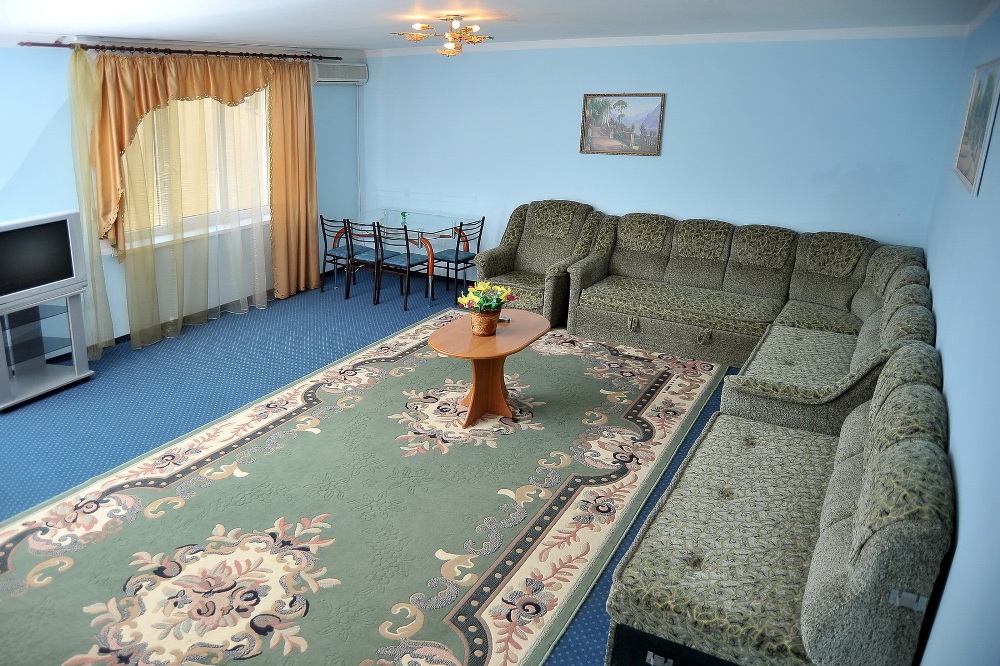 2-х уровневый 4-х комнатный Люкс (до 10 человек). Площадь – 110 кв.м. В гостиной: 2 кресла, журнальный стол, раскладывающийся диван. В спальнях – 2 стандартные кровати или большая 2-х местная кровать, ТВ, холодильник. Номер кондиционирован, оборудован стекло пакетами.