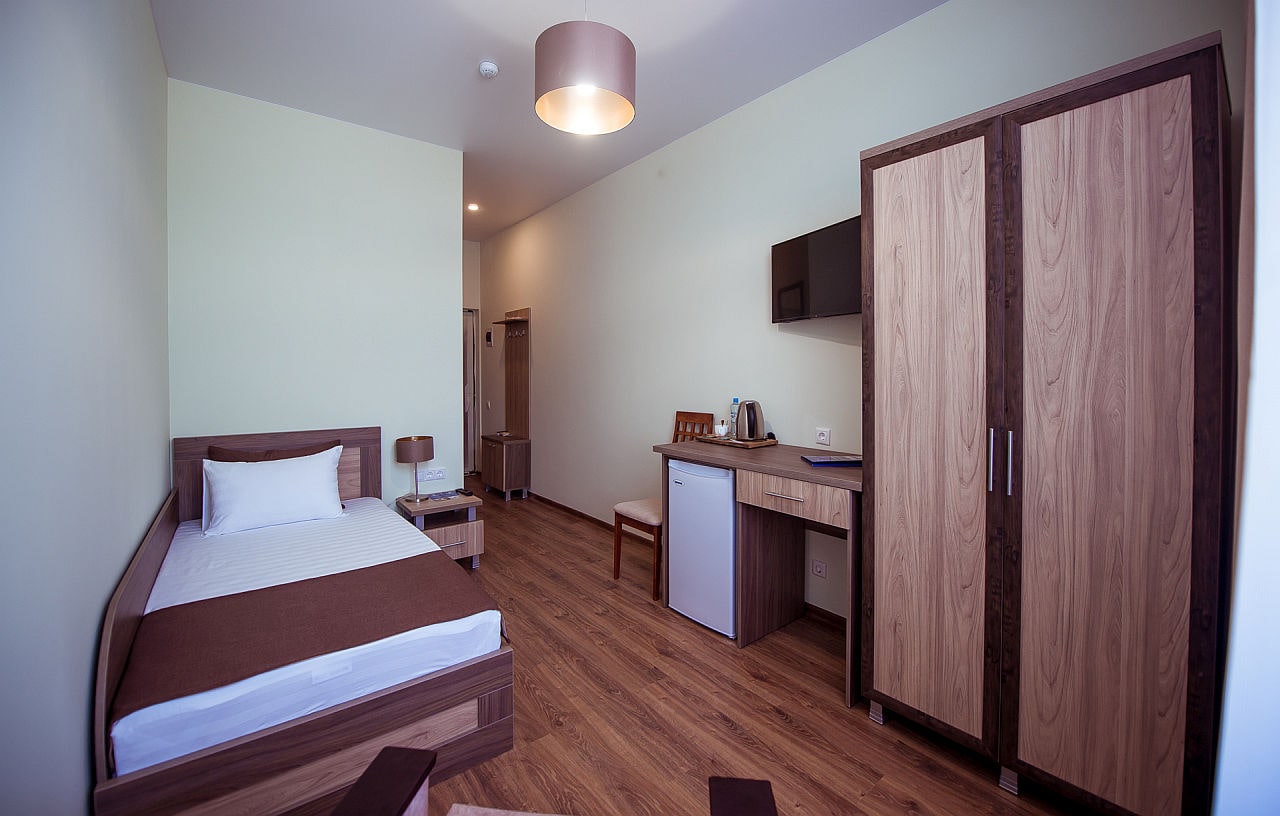 - 1-но местный 1-но комнатный стандарт Премиум. Площадь 15 кв.м. В номере: односпальная кровать 100*200 с ортопедическим матрасом, кондиционер, телевизор, холодильник, чайная станция, ванная комната с душевой кабиной.