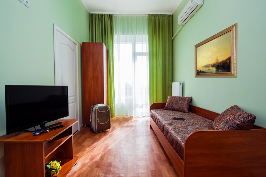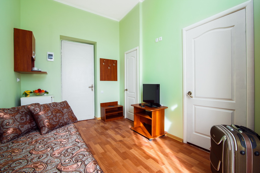 - 2-местный 2-комнатный Комфорт. Площадь: 25 кв.м. В номере: спальня с двумя односпальными кроватями, гостиная с диваном, кондиционер, телевизор, холодильник, санузел с душевой кабиной, балкон (вид на парк).