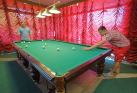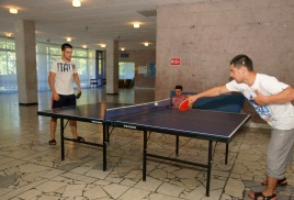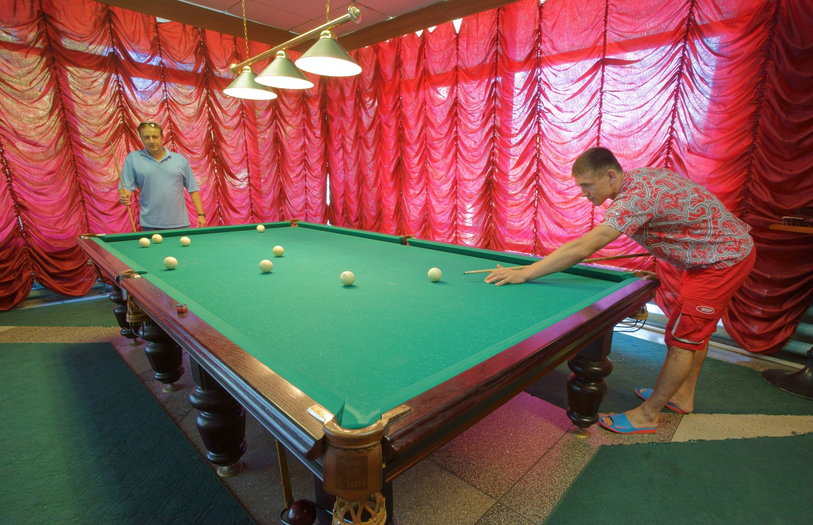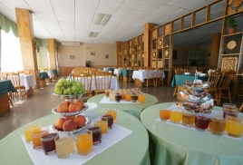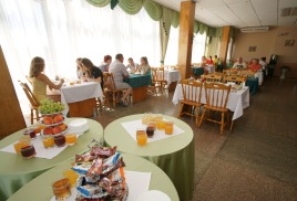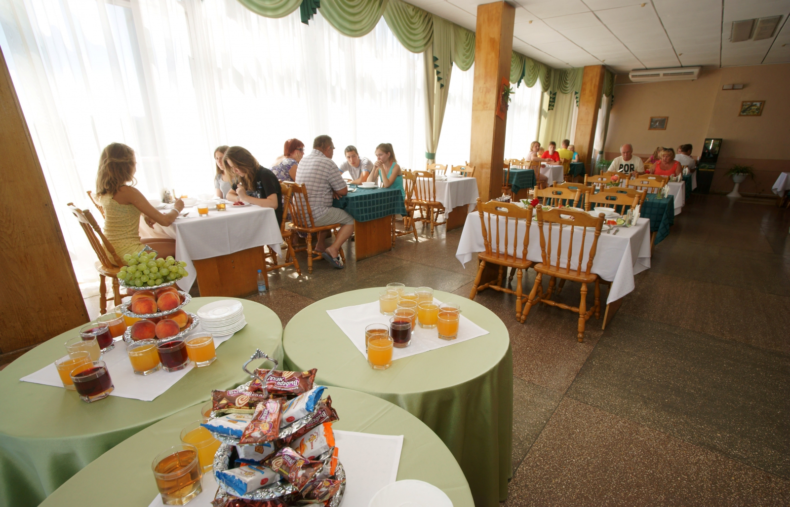 Питание в кафе по системе «шведский стол» (2-разовое, 3-разовое или только завтрак — в зависимости от выбранного тарифа). Обеденный зал кондиционирован, работает пропускная система по личным электронным карточкам.