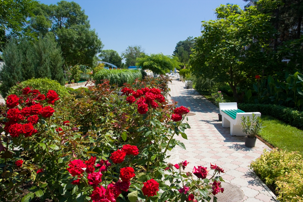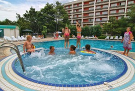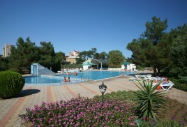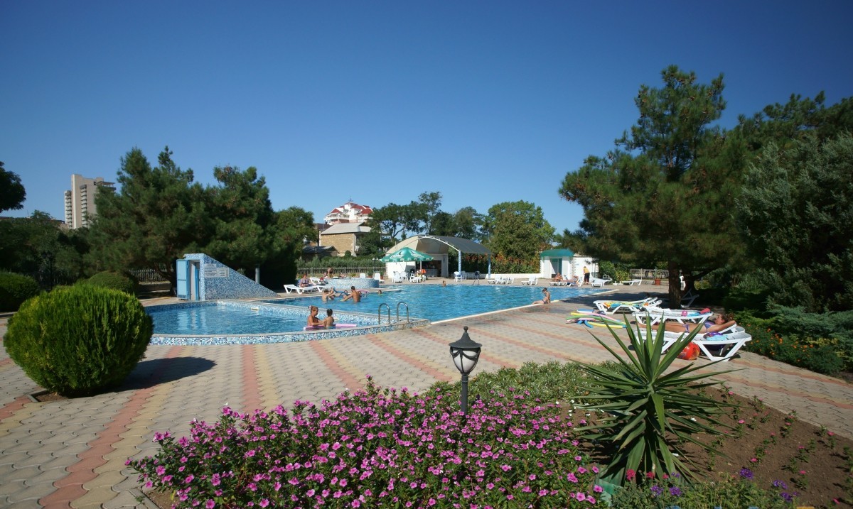 - Открытый плавательный бассейн без подогрева с детской секцией, с ванной «Джакузи», с зонтиками и шезлонгами возле бассейна (25х10 м, объем 300 куб.м).
