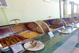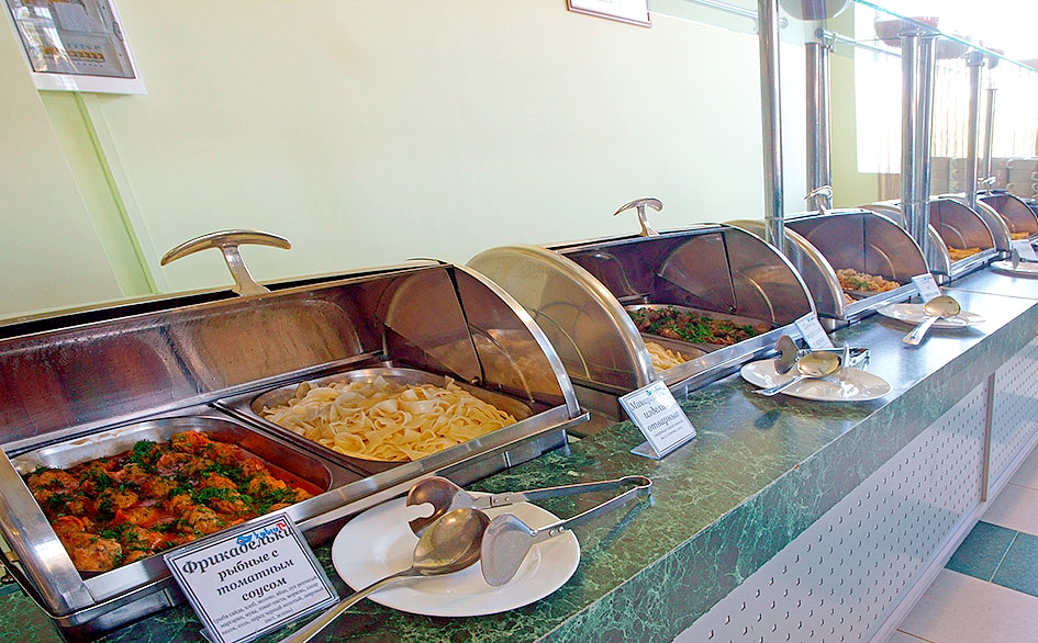 - питание по системе «шведский стол» на протяжении всего дня с 07:30 до 20:00: завтрак плавно переходящий в обед, обед плавно переходящий в ужин, с постепенной сменой ассортимента предлагаемых блюд, безалкогольные напитки: чай, кофе, компот, каркаде, лимонад, алкогольные напитки: игристый напиток, красное и белое вино, пиво (с 11:00).