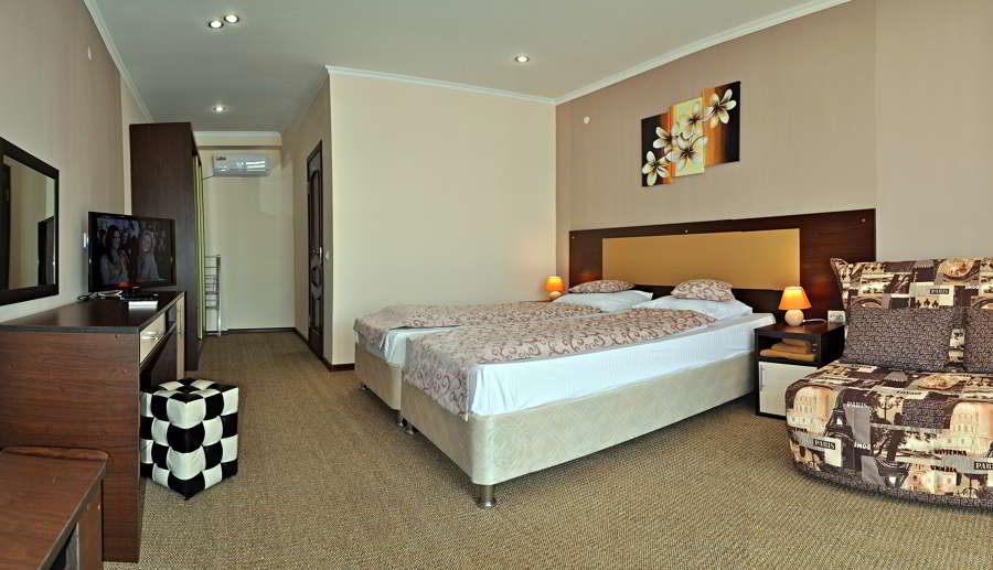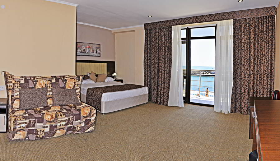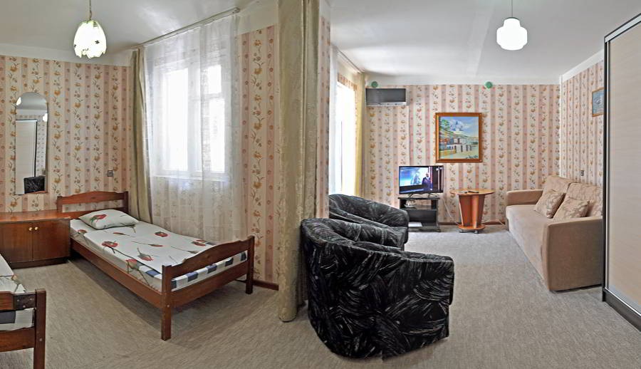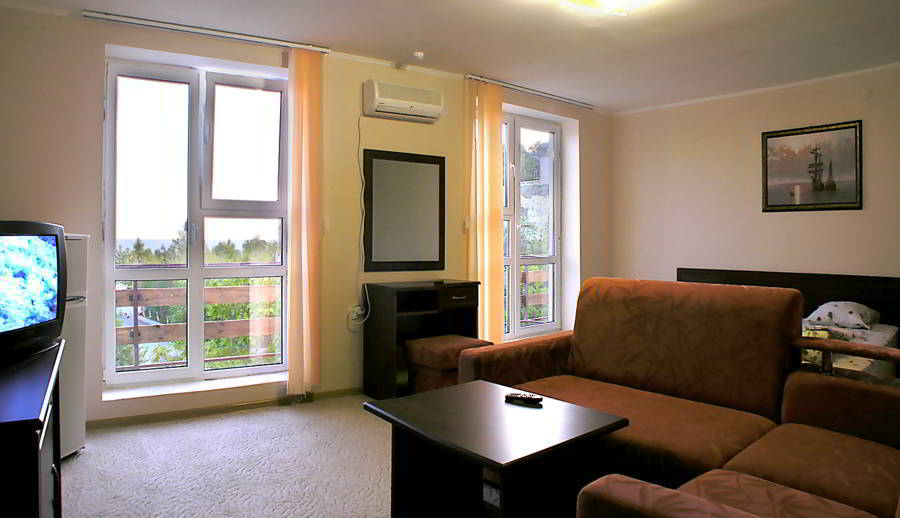 - 2-х местный номер Студия с удобствами с видом на море (42м2) (макс.2+2). В номере: две кровати бокс-спринг, диван, душ, санузел, сплит-система, балкон, ТВ, холодильник,Wi-Fi. Дополнительное место: раскладной диван.