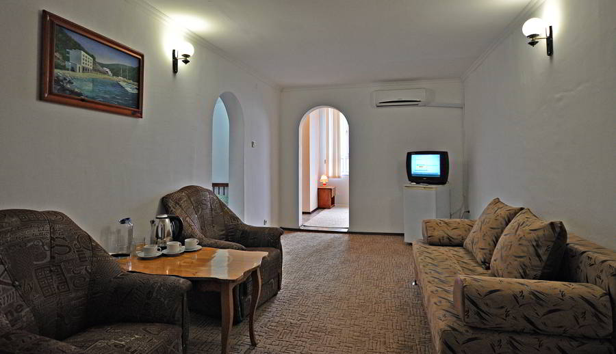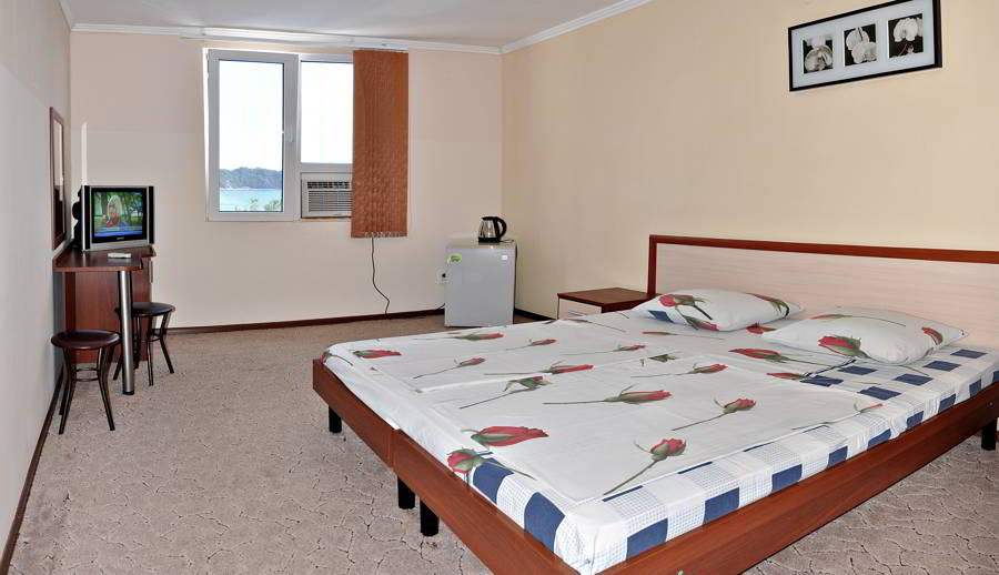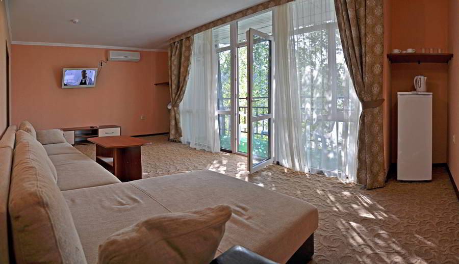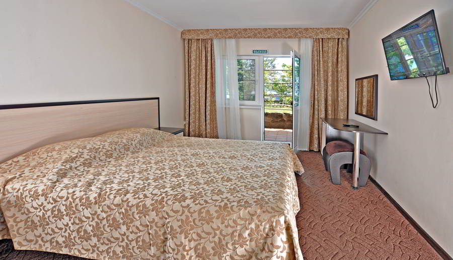 - 2-х местный 1,5 комнатный номер с удобствами (24м2) с видом на море (макс.2+1). В номере: 1,5 комнаты, разделенные аркой , две кровати бокс-спринг, мини-диван, душ, санузел, сплит-система, ТВ, холодильник, Wi-Fi. В номерах – собственная терраса, оборудованная столиком, стульями, сушилкой для купальных принадлежностей. Дополнительное место: мини-диван. Второе доп. место по запросу.