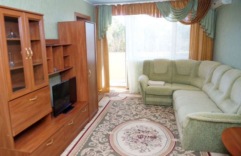 - 2-местный 2-комнатный номер. В номере: спальня с двуспальной кроватью, гостиная с диваном, кондиционер, телевизор, холодильник, утюг, гладильная доска, сушилка, электрочайник, набор посуды, санузел, фен, балкон.