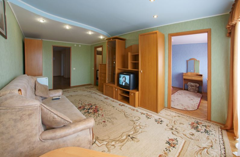 - 2-местный 2-комнатный номер (2 этаж). В номере: спальня с двуспальной кроватью, гостиная с диваном, холодильник, телевизор, кондиционер, утюг, гладильная доска, фен, набор посуды, санузел с душевой кабиной, балкон.
