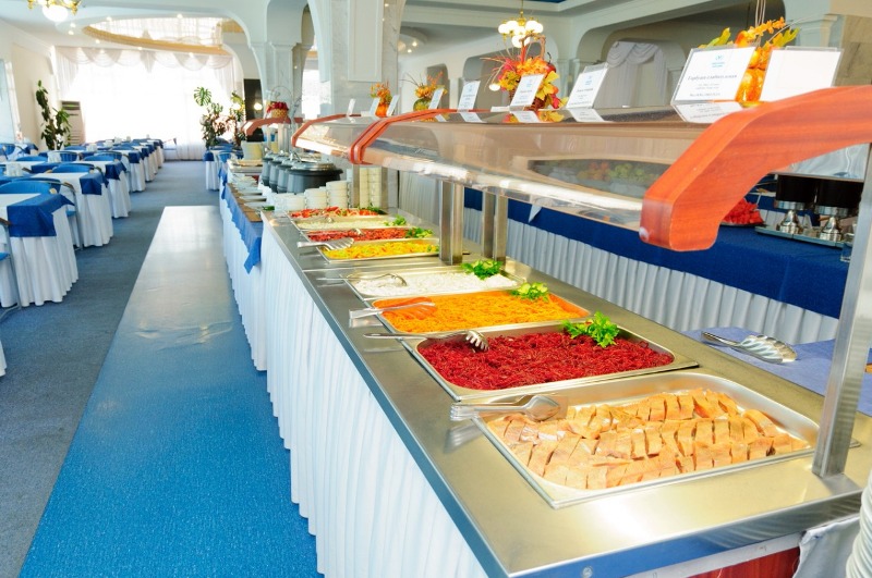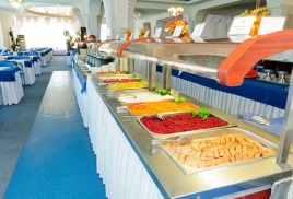 - 3-х разовое "шведский стол"; два зала питания: «Рубин» рассчитан на 136 посадочных мест, «Сапфир» рассчитан на 202 посадочных места.