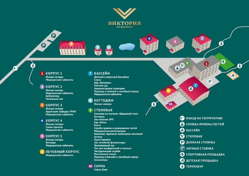 5 жилых корпусов и 2 комфортабельных коттеджа санатория «Виктория» предлагают широкий выбор вариантов размещения на любой вкус – для семей с детьми, любителей тишины и уединения, индивидуальных гостей и больших компаний, абсолютно для всех мы подберем подходящий и удобный номер.