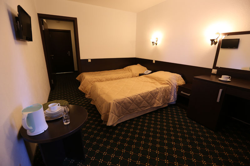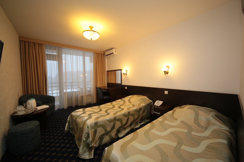 - 2-х местный 1-но комнатный номер стандарт. В номере: душевая кабина, туалет, фен, ТВ, мини-бар, кондиционер, телефон, балкон. Вид на лес/ на пруд;