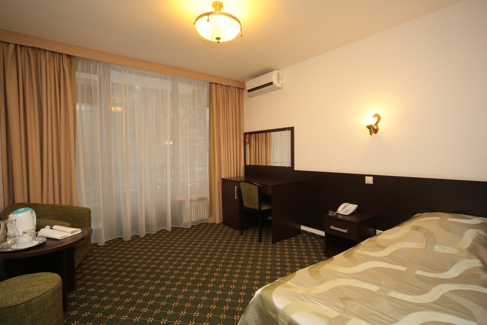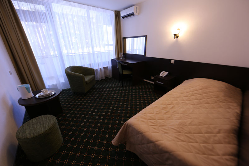 - 1-но местный 1-но комнатный номер стандарт. В номере: душевая кабина, туалет, фен, ТВ, мини-бар, кондиционер, телефон, балкон. Вид на лес/ на пруд;