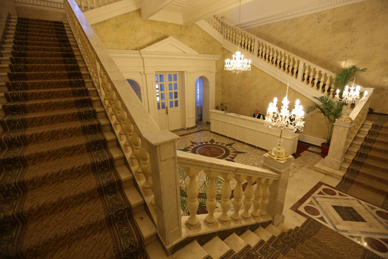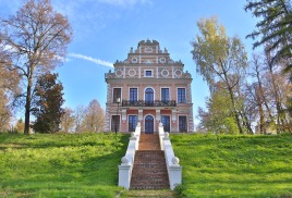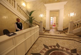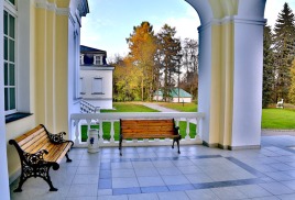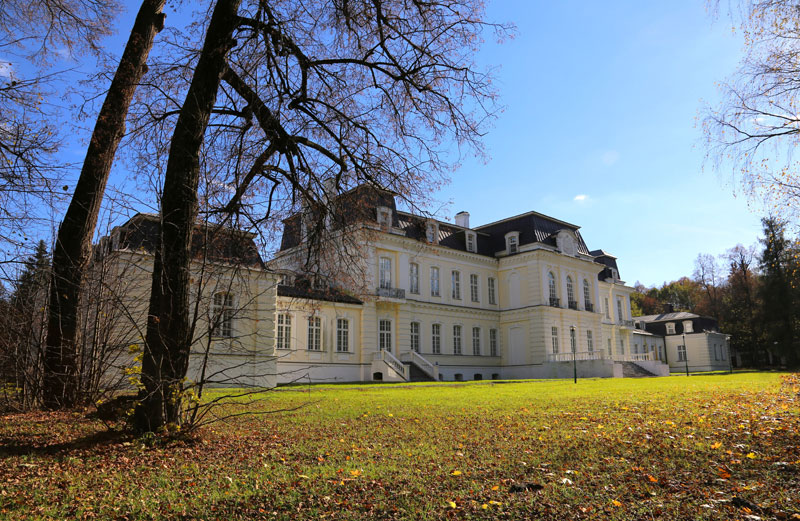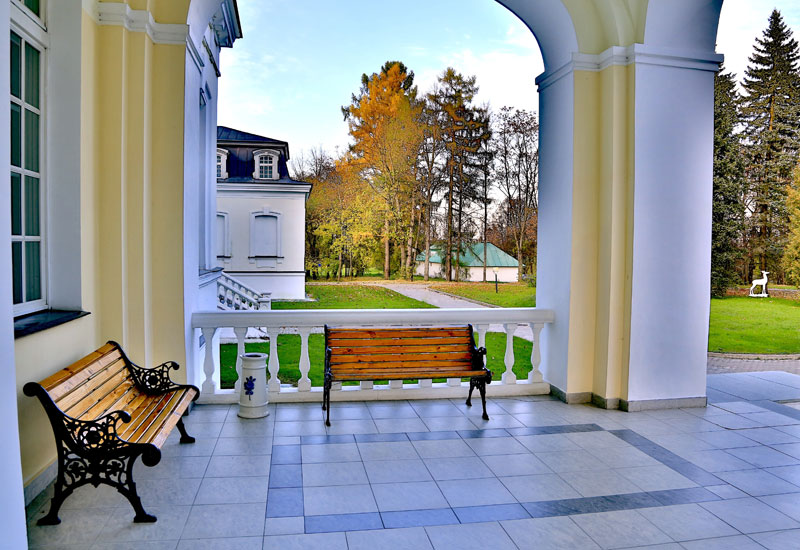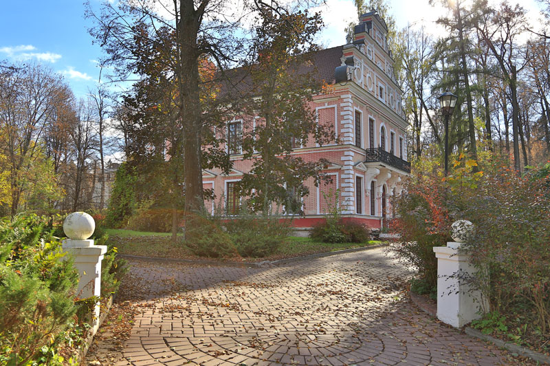 Внутреннее убранство дворца, изысканная мебель, стилизованная под старину, полный набор удобств создают роскошную атмосферу, располагающую к размеренному комфортабельному отдыху. Дворцовое здание усадьбы окружено старинным парком с ухоженными аллеями.