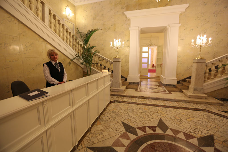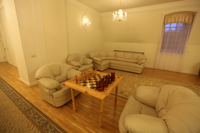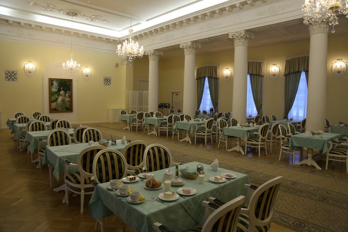 Питание для проживающих в первом корпусе организовано в столовом зале, для проживающих в усадьбе (корпус 2) и голландском домике (корпус 3) питание организованно в столовом зале в усадьбе (корпус 2).