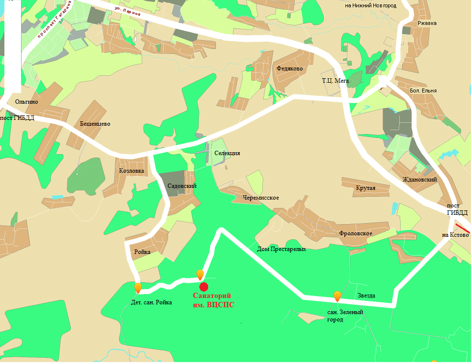 Адрес: г. Нижний Новгород, курортный поселок Зеленый город, "Санаторий им. ВЦСПС".