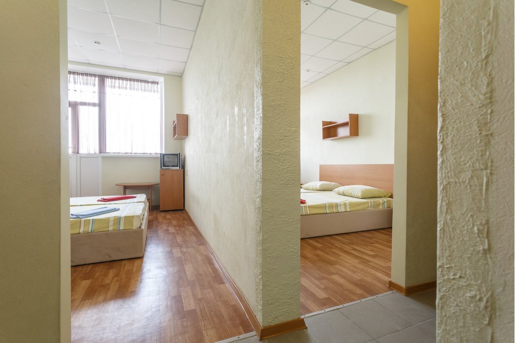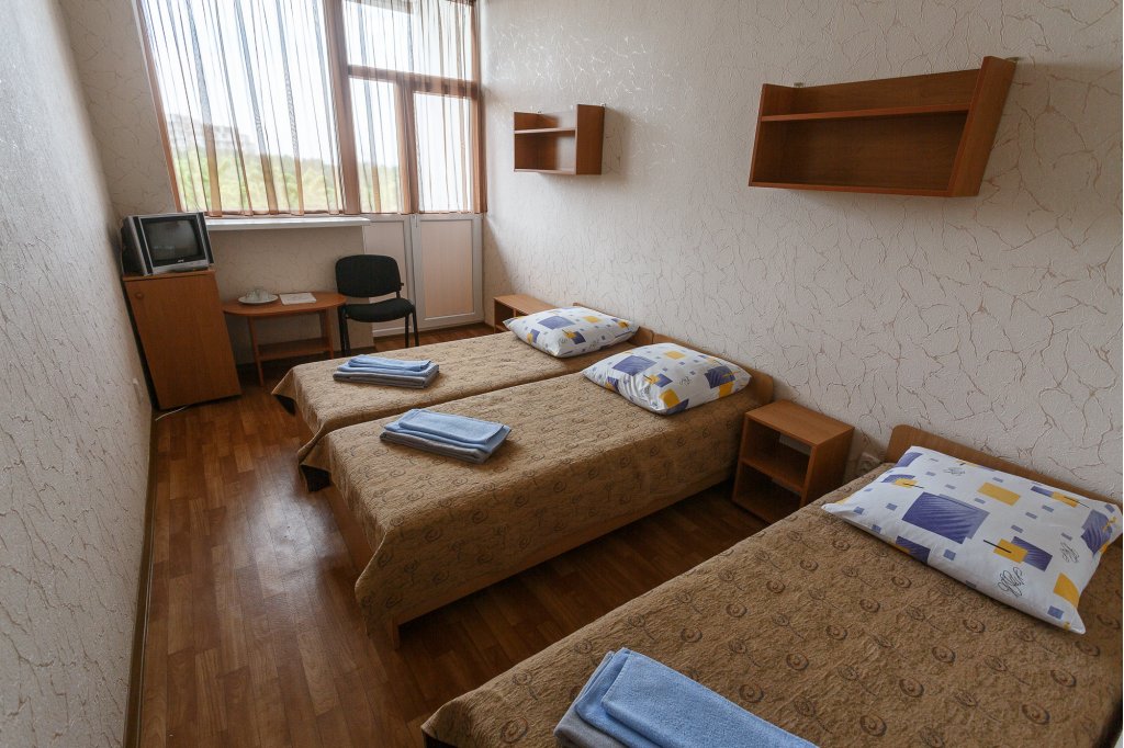 - 3-х местный СТАНДАРТ 1 КАТЕГОРИИ - однокомнатный номер. В номере: две односпальных кровати, телевизор, холодильник, шкаф, душ, туалет, умывальник, балкон. Дополнительное место не устанавливается.