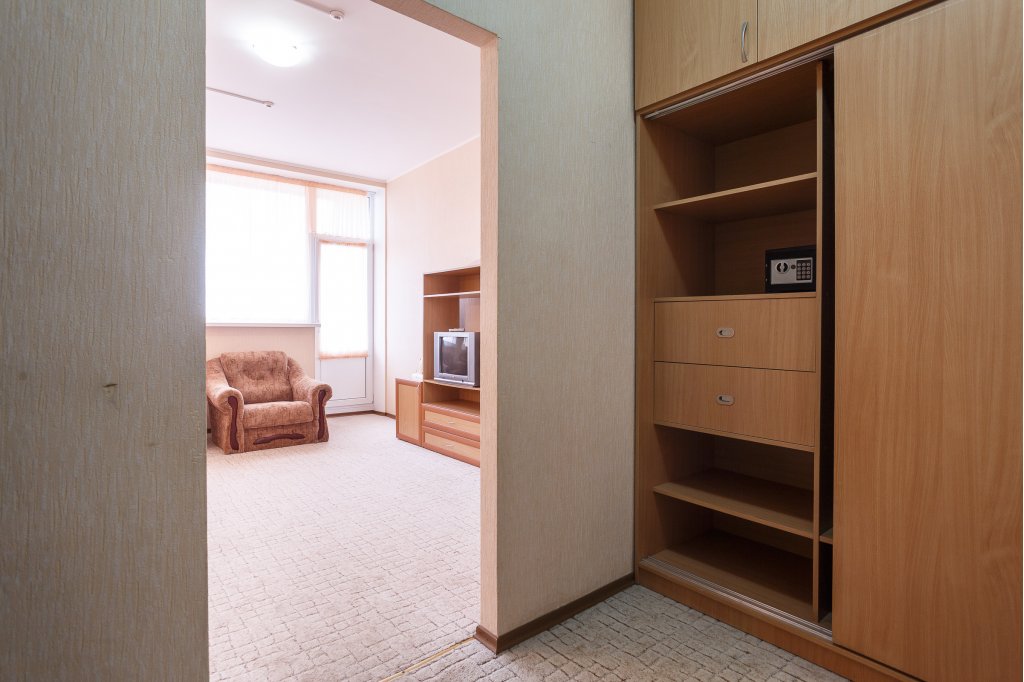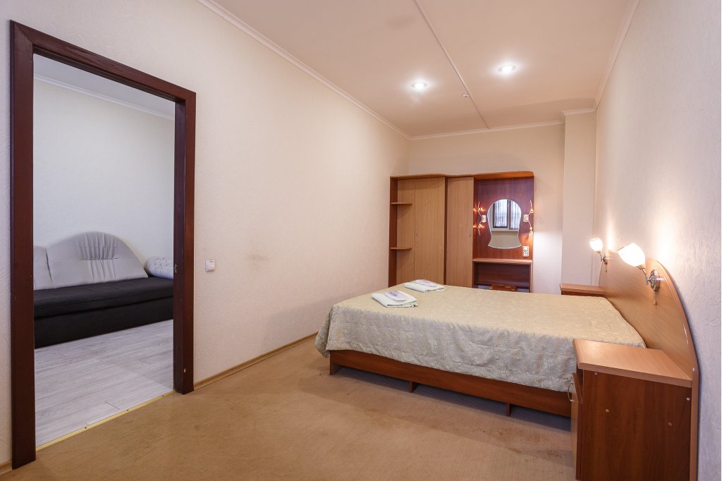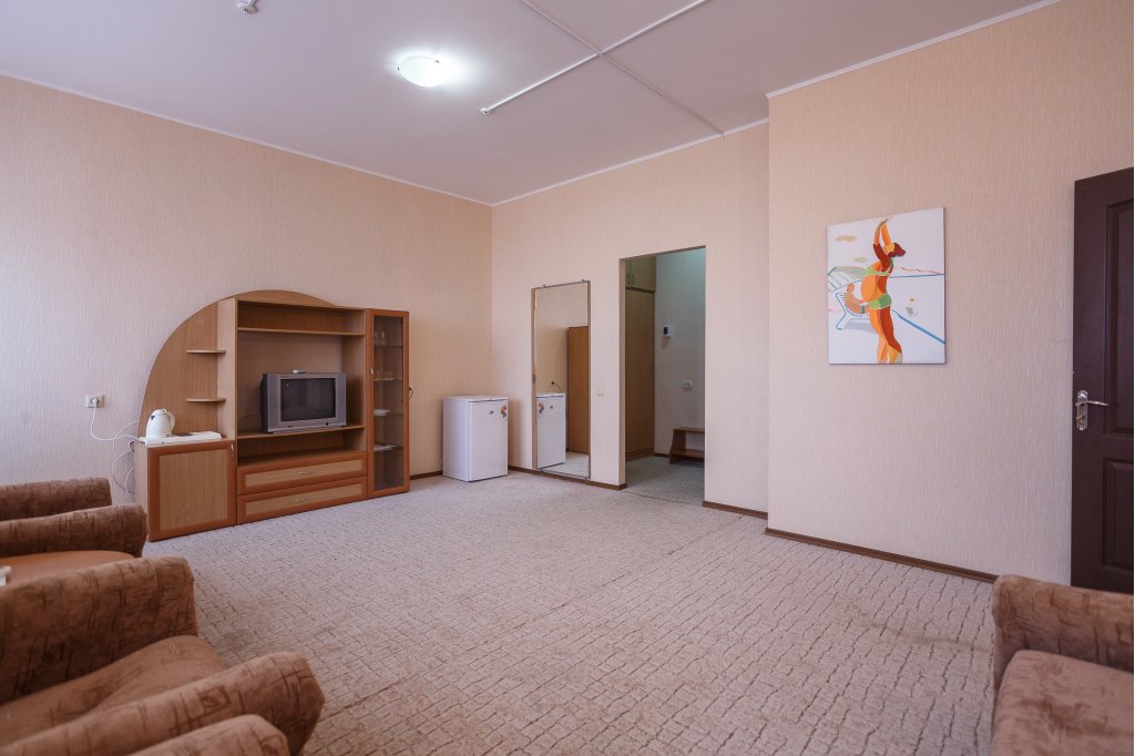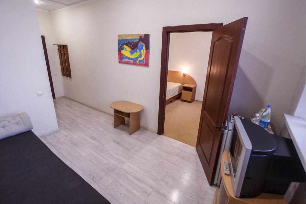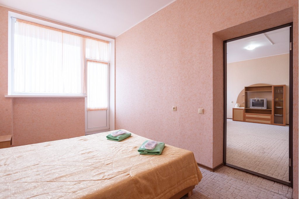 - ДЖУНИОР СЮИТ - двухкомнатный номер с возможностью разместиться до 5-х человек. В номере: двуспальная кровать, диван, телевизор, холодильник, кондиционер, чайные принадлежности (чайник, посуда), шкаф, сейф, санузел с душевой кабиной, фен, туалетные принадлежности, балкон.