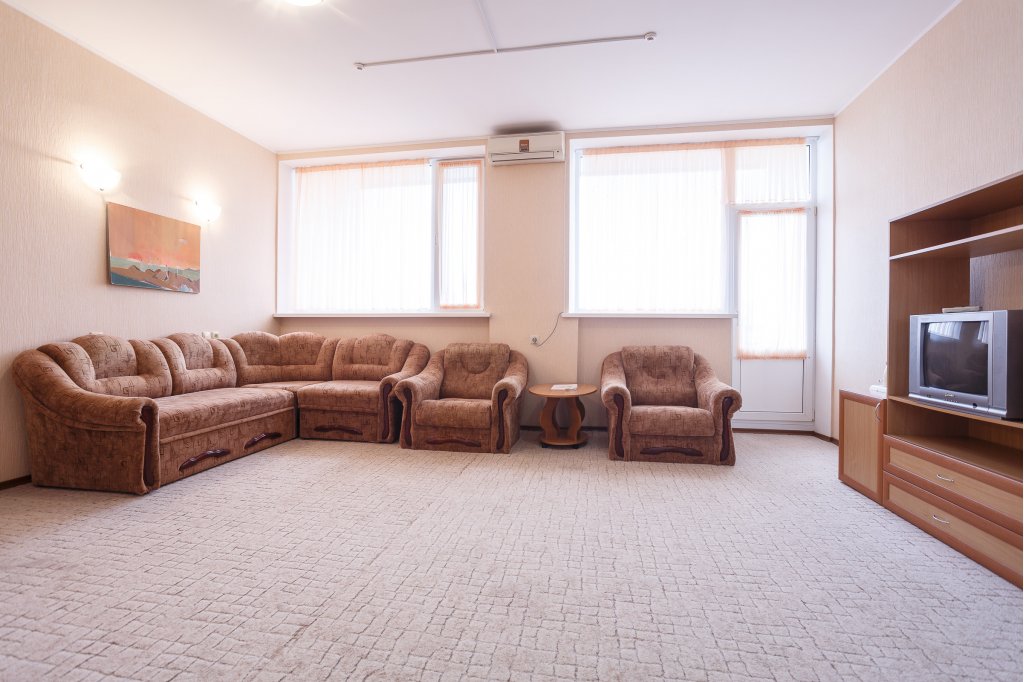 - ЛЮКС - двухкомнатный номер с возможностью разместиться до 6-х человек. В номере: двуспальная кровать, мягкая мебель, телевизор, холодильник, кондиционер, шкаф, чайные принадлежности (чайник, посуда), сейф, санузел с душевой кабиной, фен, туалетные принадлежност, балкон.