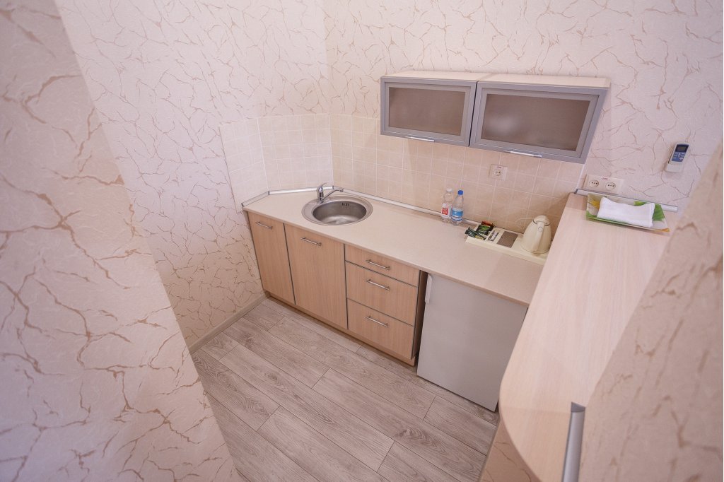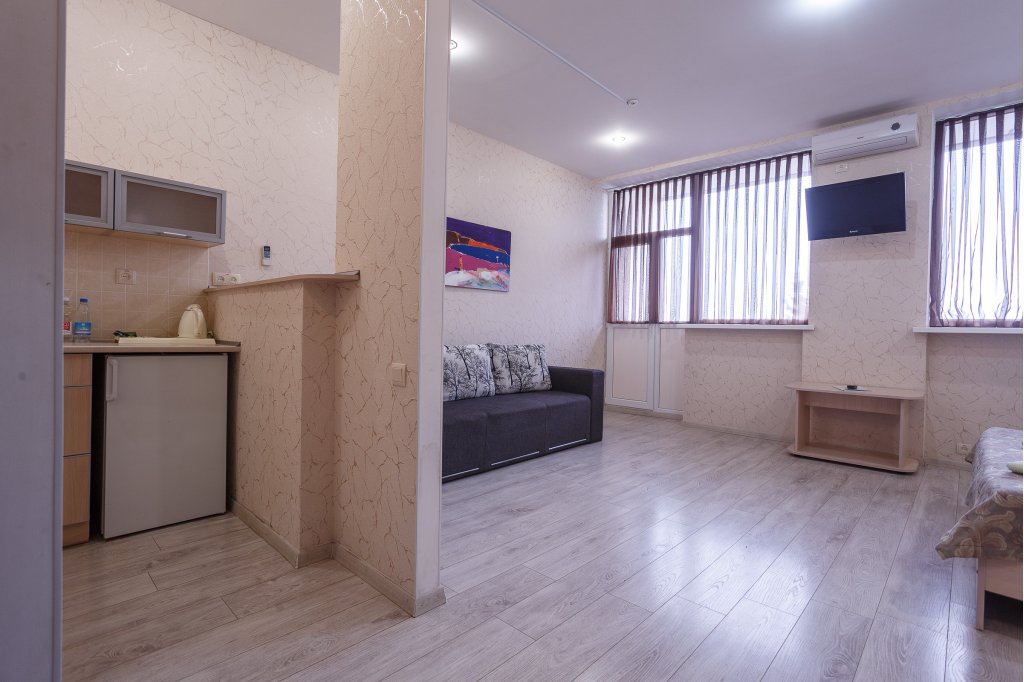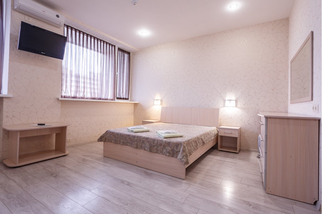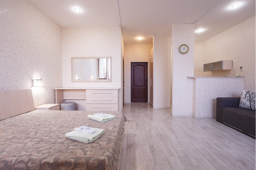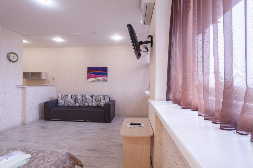- ЛЮКС-СТУДИЯ - однокомнатный номер с возможностью разместиться до 4-х человек. В номере: двуспальная кровать, телевизор, холодильник, кондиционер, мини-кухня, чайные принадлежности (чайник, посуда), шкаф, сейф, санузел с ванной, фен, туалетные принадлежности, балкон.