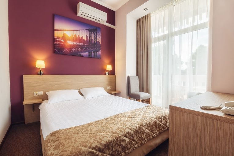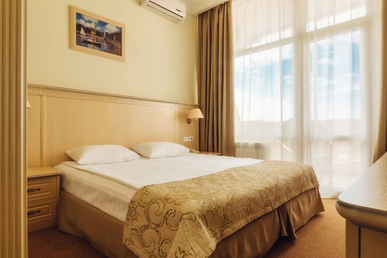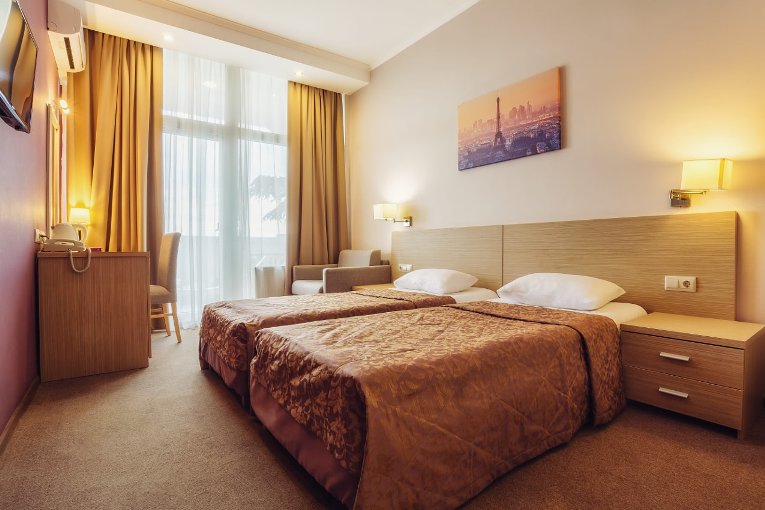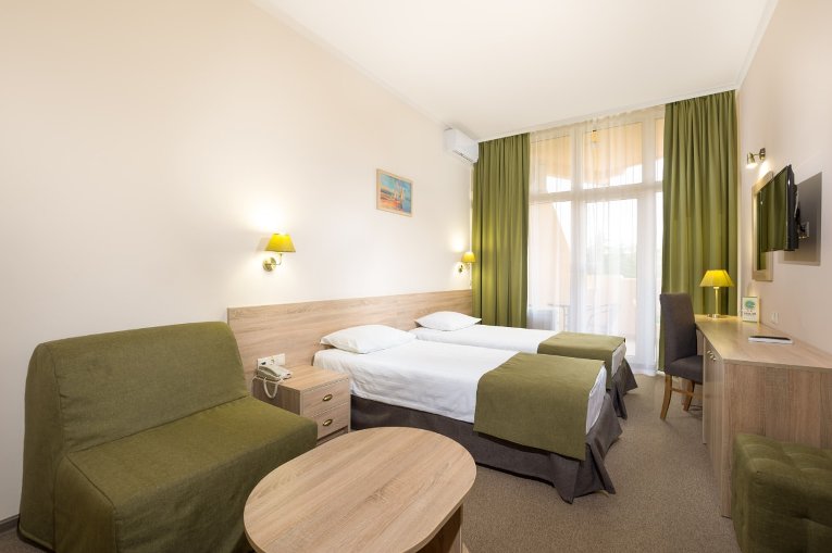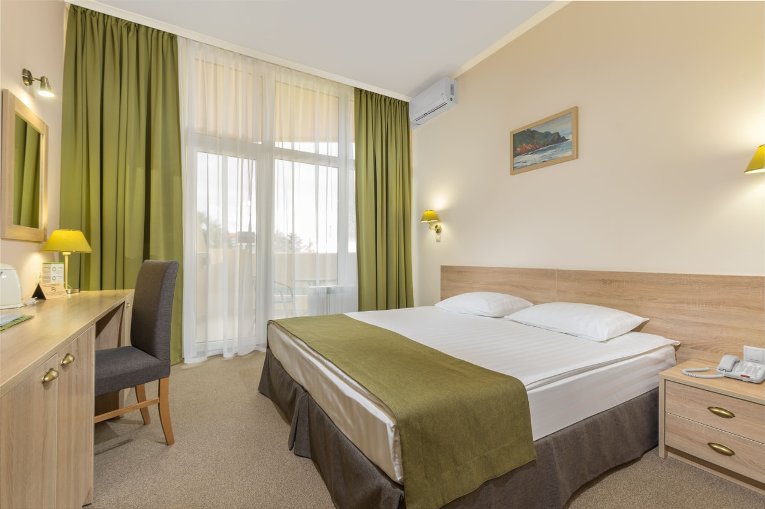 - 2-местный Стандарт. Площадь: 16 кв.м. В номере: две односпальные кровати или одна двуспальная кровать, холодильник, телевизор, набор чайной посуды сейф, санузел с душем, набор миникосметики, халат и тапочки. Балкон с видом на море. Дополнительно место не устанавливатеся.