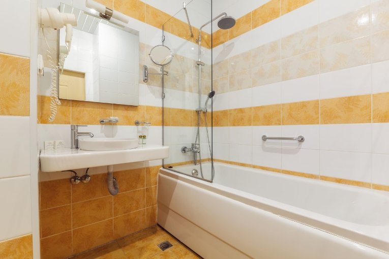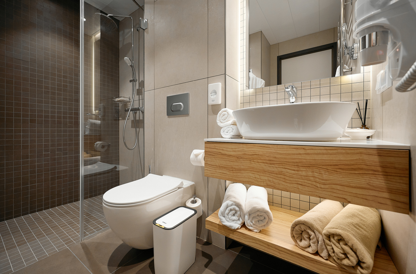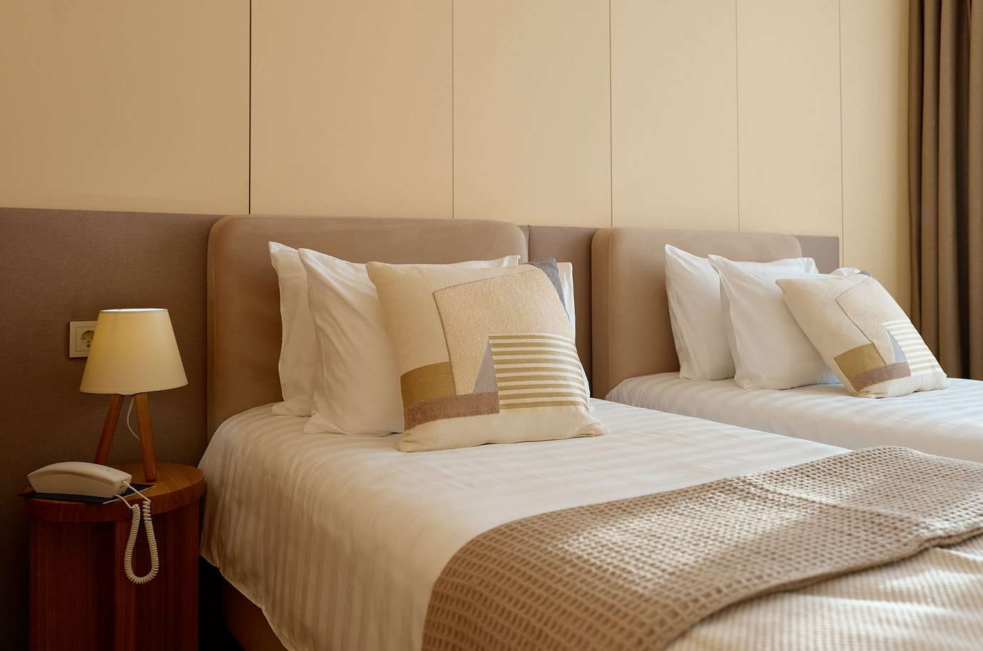 - 2-местный "Стандарт" с раздельными кроватями (макс. 2+1 чел., 15 кв. м, телевизор, кондиционер, душ/ ванна, туалет, холодильник, набор посуды, 1-спальные кровати, сейф). Доп. место - кресло-кровать, может быть установлено без ограничения по возрасту.