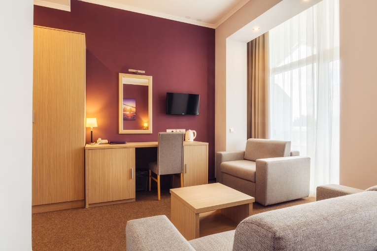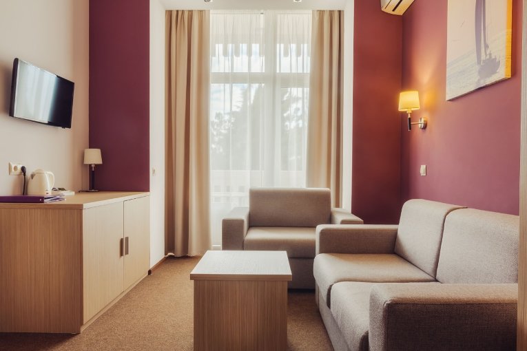 - 2-местный 2-х комнатный "Супериор с балконом" (макс. 2+2 чел., 31 кв. м, телевизор, кондиционер, душ/ ванна, туалет, фен, холодильник, электрочайник, телефон, мягкая мебель, сейф, спальня с двумя раздельными или одной двуспальной кроватью). Доп. место - диван, без ограничения по возрасту.