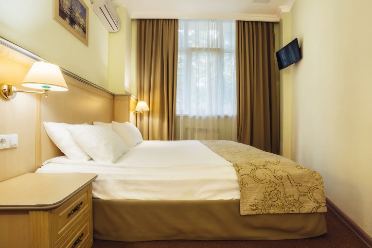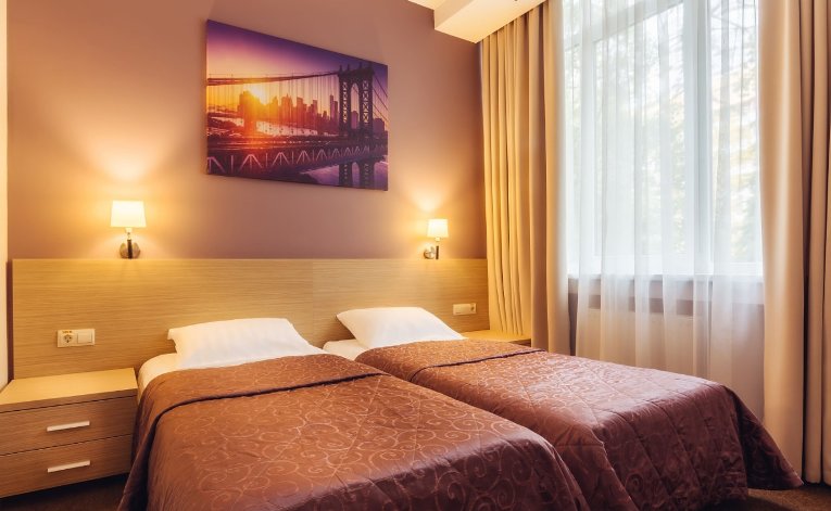 - 2-местный "Стандарт" с 2-спальной кроватью (макс. 2 чел., 15 кв. м, телевизор, кондиционер, душ/ ванна, туалет, холодильник, набор посуды, 2-спальная кровать, сейф).
