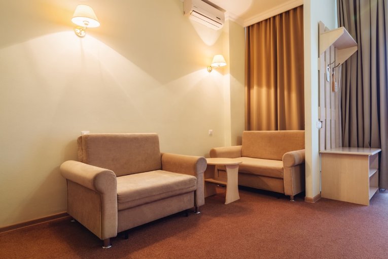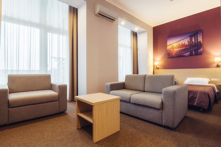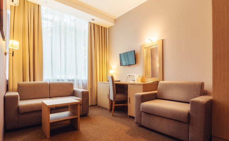 - 2-местный 2-комнатный номер "Стандарт" (макс. 2+2 чел., 26 кв. м, телевизор, кондиционер, душ/ ванна, туалет, фен, холодильник, электрочайник, телефон, мягкая мебель, сейф). Доп. место - диван, без ограничения по возрасту.