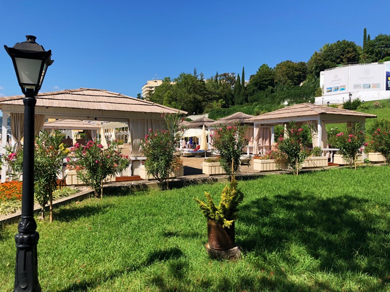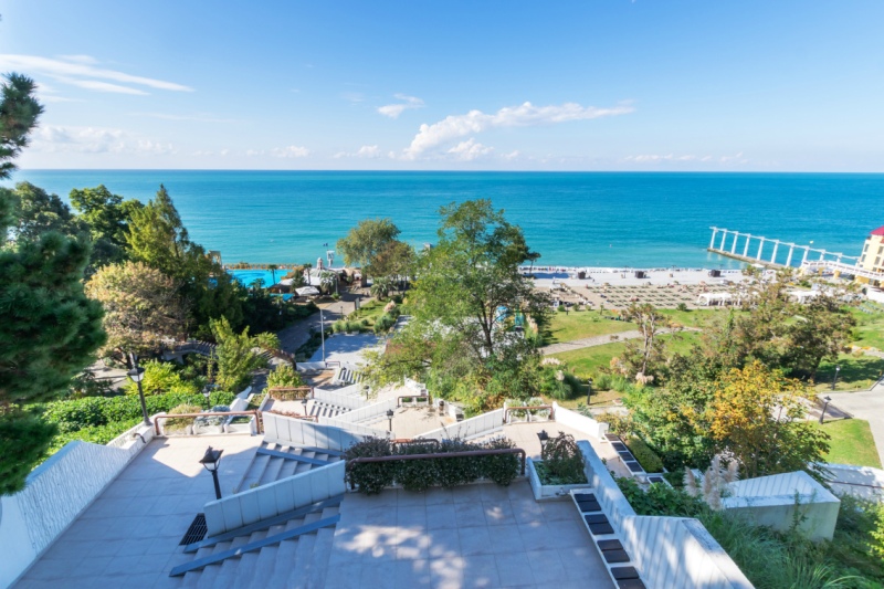 Гости санатория могут пользоваться термальным и водными комплексами, большим количеством бассейнов, а также наслаждаться отдыхом на оборудованном пляже высшей первой категории, общая площадь которого составляет около 7500 м2, а протяженность - 320 м. Покрытие пляжа – мелкая галька, она наиболее комфортна для отдыха на море. Для вашего удобства работает лифт для спуска к пляжу и подъема на территорию.