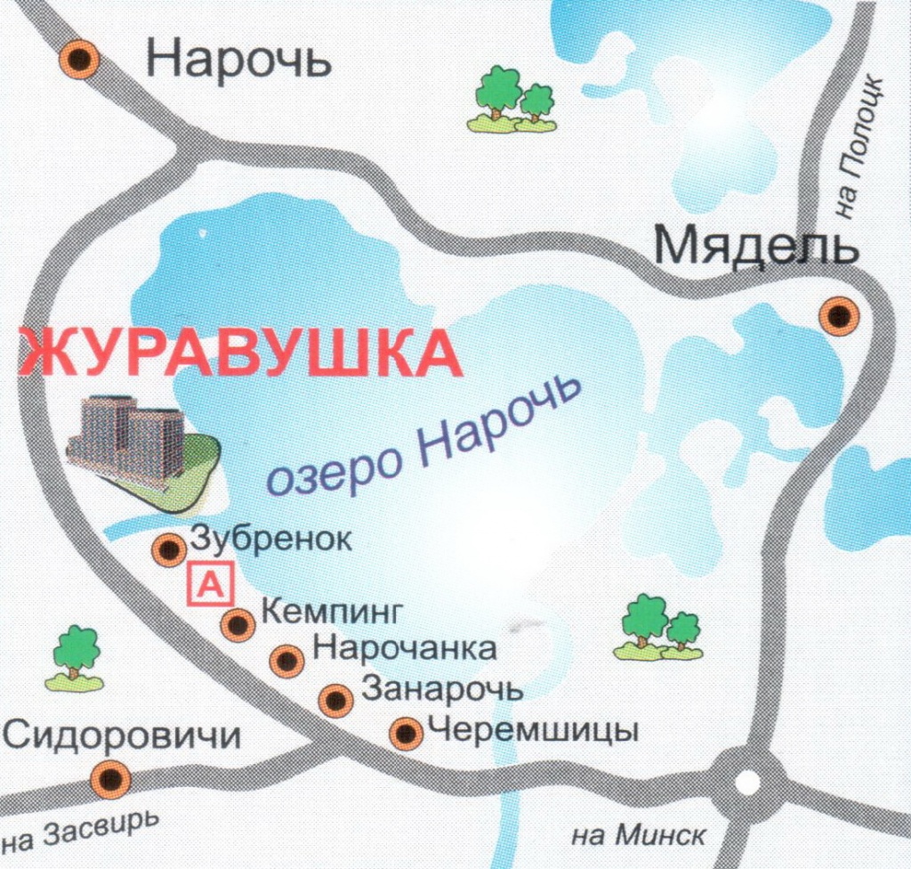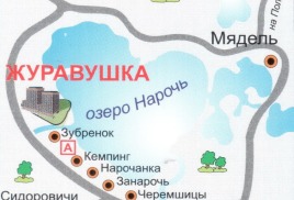 - г. Мядель – санаторий «Журавушка» (около 26 км): по трассе Р28 (Минск-Молодечно-Нарочь) до пересечения с трассой Р60 (Купа-Занарочь – Брусы) (около 14 км); налево, по трассе Р60 (Купа – Занарочь – Брусы), следуя указателям, до санатория «Журавушка» (около 12 км).