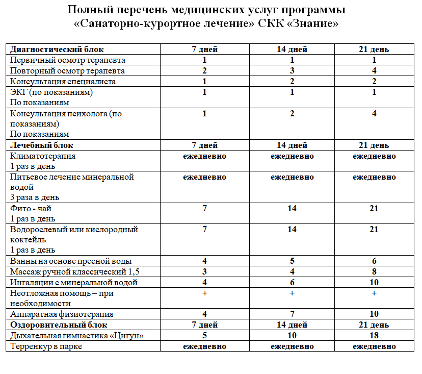 В стоимость входит: проживание в номере выбранной категории; трех разовое питание по системе «Шведский стол»; лечение по назначению врача по показаниям в соответствии со стандартами санаторно-курортного лечения (наличие санаторно-курортной карты обязательно); бассейн крытый/открытый; пляж; бювет с минеральной водой; высокоскоростной Wi-Fi; услуги детской комнаты.